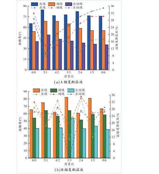 1)與純水相比,復配后的A、B 2組溶液的接觸角明顯降低,對于焦煤、褐煤、長焰煤,B組溶液復配質(zhì)量比為2∶4時接觸角降低最多,分別為31.131%,27.969%、14.713%;對于焦煤,A組溶液復配質(zhì)量比為6∶0時接觸角降低最多,為26.452%,對于褐煤、長焰煤,A組溶液復配質(zhì)量比為1∶5時接觸角降低最多,為25.982%、20.026%。
