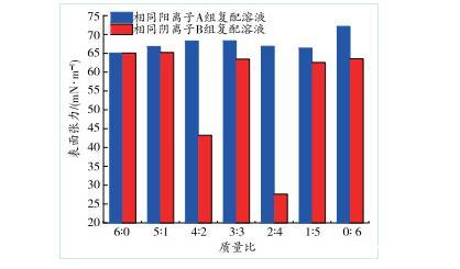 1)與純水相比,復配后的A、B 2組溶液的表面張力顯著降低,A組復配溶液的表面張力隨不同復配質(zhì)量比變化不大,B組復配溶液的表面張力易受復配質(zhì)量比變化的影響。