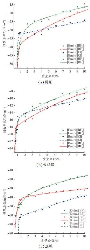 2)3種咪唑類離子液體的鋪展系數(shù)隨離子液體質(zhì)量分數(shù)的增大而迅速增大,長焰煤的親水能力最好,而焦煤的親水能力最差,這與煤中親水基團和疏水基團的含量有關(guān);