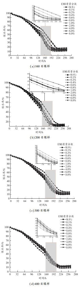 對比不同質(zhì)量分數(shù)EMI溶液對不同粒徑煤樣保水率的影響曲線(見圖9)可以發(fā)現(xiàn),在160目測試煤樣中,煤樣在溶液中EMI質(zhì)量分數(shù)為1.0%時靜置,出現(xiàn)了析水現(xiàn)象。相比于160目測試煤樣,200目和300目測試煤樣分別在EMI質(zhì)量分數(shù)為2.0%、6.0%的溶液中靜置,出現(xiàn)了析水現(xiàn)象。160、200、300目3組測試煤樣,在EMI質(zhì)量分數(shù)小于6.0%的溶液的保水率在216 h后趨于穩(wěn)定,400目測試煤樣在208 h后趨于穩(wěn)定;而在EMI質(zhì)量分數(shù)為6.0%與8.0%溶液中,160、200、300、400目測試煤樣分別在240、248、232、216 h后保水率趨于穩(wěn)定,穩(wěn)定時間均大幅提高。說明溶液中EMI質(zhì)量分數(shù)越高,煤塵的保水效果越好。