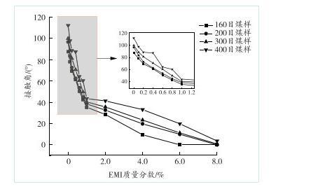 由圖5可知,針對160目測試煤樣,溶液中EMI質(zhì)量分數(shù)大于2.0%后,接觸角的減小率更高,當溶液中EMI質(zhì)量分數(shù)為6.0%時,接觸角為0°,煤樣被快速潤濕,達到完全潤濕狀態(tài)。EMI質(zhì)量分數(shù)相同時,200目與300目測試煤樣的變化趨勢大致相同。200目測試煤樣在EMI質(zhì)量分數(shù)小于1.0%的溶液時,接觸角呈線性減小趨勢,當大于1.0%后,接觸角減小率出現(xiàn)先逐漸變緩而后逐漸增大的細微波動;300目測試煤樣在EMI質(zhì)量分數(shù)為0.1%~0.6%時,接觸角減小率出現(xiàn)細微波動,呈先變緩后逐步增大的趨勢;當溶液中EMI質(zhì)量分數(shù)達到8.0%時,兩組測試煤樣均達到完全潤濕狀態(tài),接觸角為0°。而400目測試煤樣的煤塵粒徑最小,煤樣的潤濕性較弱,當溶液中EMI質(zhì)量分數(shù)為0.8%~2.0%時,接觸角減小率呈先逐漸增大而后逐漸變緩的趨勢;當溶液中EMI質(zhì)量分數(shù)大于2.0%時,接觸角的減小率呈線性降低趨勢;當溶液中EMI質(zhì)量分數(shù)達到8.0%時,煤樣還未達到完全潤濕狀態(tài)。