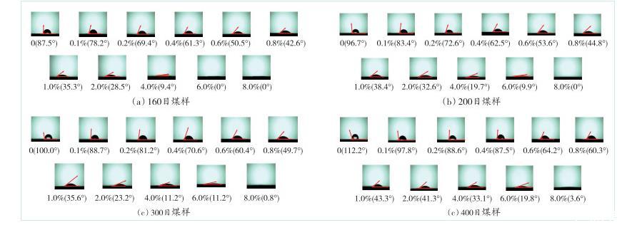 接觸角是指在氣、液、固三相交界處的氣—液界面和固—液界面之間的夾角。接觸角作為測試液體對固體潤濕效果的重要參數(shù),對測試煤塵的潤濕性具有重要作用,接觸角越小,液體對固體的潤濕效果越強。利用接觸角測量儀,對液滴與測試煤樣之間的接觸角進行成像,如圖4所示(圖像從左到右,溶液中EMI質(zhì)量分數(shù)逐漸增大)。由圖4可知,隨著煤樣粒徑的減小,4種煤樣與液滴之間的接觸角均逐漸增大。當加入EMI溶液后,4種煤樣的接觸角隨溶液中EMI質(zhì)量分數(shù)增大而變化的趨勢大致相同,均呈現(xiàn)出逐漸減小的趨勢,表面疏水性減弱,煤塵潤濕性增強。