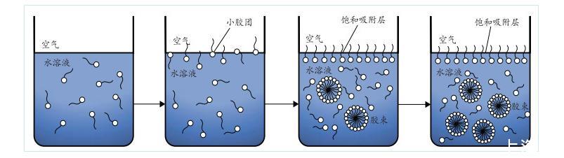 由圖2可知,隨著溶液中EMI質(zhì)量分數(shù)的增大,表面張力持續(xù)降低。當溶液中EMI質(zhì)量分數(shù)大于0.6%后,表面張力的變化趨勢逐漸變緩,幾乎維持在同一水平。出現(xiàn)這種現(xiàn)象的主要原因在于加入溶液中的EMI會對溶液的表面張力產(chǎn)生重要影響。EMI分子本身具有兩親性質(zhì),其中有機高分子會在溶液的表面形成吸附,并在液面定向排列,使疏水基擴展于空氣中,親水基則與水面吸附,溶液中EMI分子吸附狀態(tài)隨其質(zhì)量分數(shù)變化情況如圖3所示。吸附于水面的EMI分子達到飽和狀態(tài)時,EMI溶液的膠束質(zhì)量分數(shù)便達到臨界值,EMI分子開始締合逐步形成膠束聚集物,該質(zhì)量分數(shù)即為溶液的CMC值。之后,繼續(xù)加入EMI溶液,表面張力不再發(fā)生較大波動,溶液內(nèi)逐漸締合成更多穩(wěn)定的膠束。