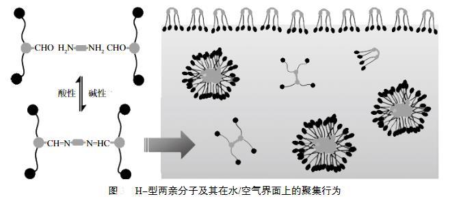 另外一類是含有活性可斷裂鍵的表面活性劑,其中亞胺鍵是一類比較典型的動態(tài)共價鍵。許多新穎的基于亞胺鍵構(gòu)筑的H-型兩親分子,其中亞胺鍵用于連接兩個Bola型的兩親分子,H-型兩親分子自組裝可形成膠束,當pH從堿性調(diào)至弱酸性時,亞胺鍵發(fā)生水解,從而導致兩親分子的解離以及不同聚集體形態(tài)之間的轉(zhuǎn)變。