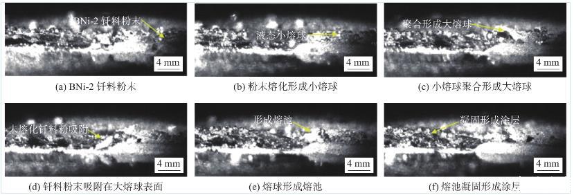圖3是激光釬涂過程中的超高速攝影照片(4000幅/s),直觀地表征了激光釬涂過程中釬料粉末在激光作用下熔化、鋪展、凝固的過程。從圖3中可看出,在激光釬涂過程中,釬料呈現(xiàn)4種狀態(tài),分別為粉末態(tài)、熔球態(tài)、熔池態(tài)、凝固態(tài)。在激光未掃描的位置,釬料保持原始的粉末狀態(tài),如圖3a所示。被激光束掃到的位置,粉末態(tài)的釬料吸收能量,升溫熔化,形成尺寸較小的液態(tài)熔球,如圖3b所示。隨后,粉末釬料的不斷熔化形成更多液態(tài)小熔球,尺寸較小的熔球互相結(jié)合匯聚成尺寸較大的液態(tài)熔球,如圖3c所示。同時(shí)可觀察到未熔化的釬料粉末在液/固界面張力作用下,逐漸被吸附到尺寸較大的熔球表面,如圖3d所示。隨著激光逐漸向前掃描,熔球不斷長(zhǎng)大,當(dāng)熔球固相表面張力與重力的合力作用大于液/固界面張力后,大尺寸熔球在基體鋪展?jié)櫇?,形成熔池,如圖3e所示。最后,隨著激光熱源的移動(dòng),激光后端的熔池溫度逐漸降低,液態(tài)釬料逐漸凝固,在基體表面形成涂層,如圖3f所示。