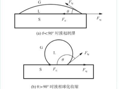 潤(rùn)濕角θ的大小直接反映了液相對(duì)固體表面的潤(rùn)濕程度,θ越小,潤(rùn)濕性就越好。當(dāng)θ為0°時(shí),表示完全潤(rùn)濕,小于時(shí)為潤(rùn)濕狀態(tài),而大于時(shí)為不潤(rùn)濕狀態(tài)。由于相同體積下,球形的表面積最小,表面張力驅(qū)使液體聚集到最小表面積狀態(tài),在釬料熔化后便聚合在一起收縮成球狀,從而發(fā)生液態(tài)釬料聚合現(xiàn)象。