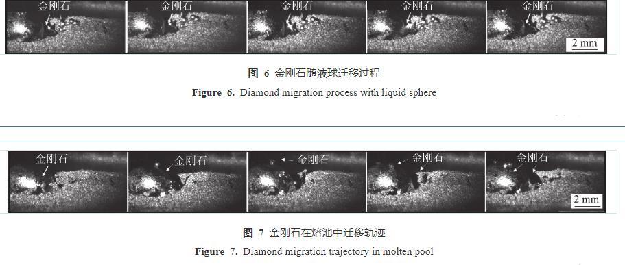 圖8為金剛石置于釬料底部時(shí),金剛石在激光釬涂過程中運(yùn)動(dòng)軌跡??梢姡瑹o論金剛石是直接鋪置于釬料表面,還是置于釬料底部,在釬涂過程中,金剛石均會(huì)上浮到涂層表層。具體過程為在激光熱源作用下,表層的釬料開始熔化成液態(tài)小球,由于金剛石的高透光性和高熔點(diǎn),金剛石不會(huì)熔化。在液態(tài)小球聚集長(zhǎng)大的過程中,金剛石沿著液球邊緣運(yùn)動(dòng),當(dāng)液態(tài)小球匯入大熔球時(shí),金剛石繼續(xù)沿著大熔球的邊緣向表面運(yùn)動(dòng),最后凝固于釬料涂層表層。