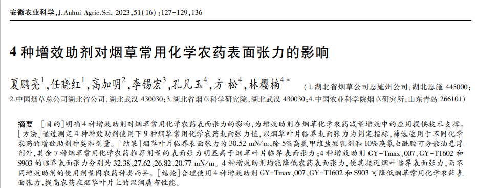 [目的]明確4種增效助劑對(duì)煙草常用化學(xué)農(nóng)藥表面張力的影響,為增效助劑在煙草化學(xué)農(nóng)藥減量增效中的應(yīng)用提供技術(shù)支撐。