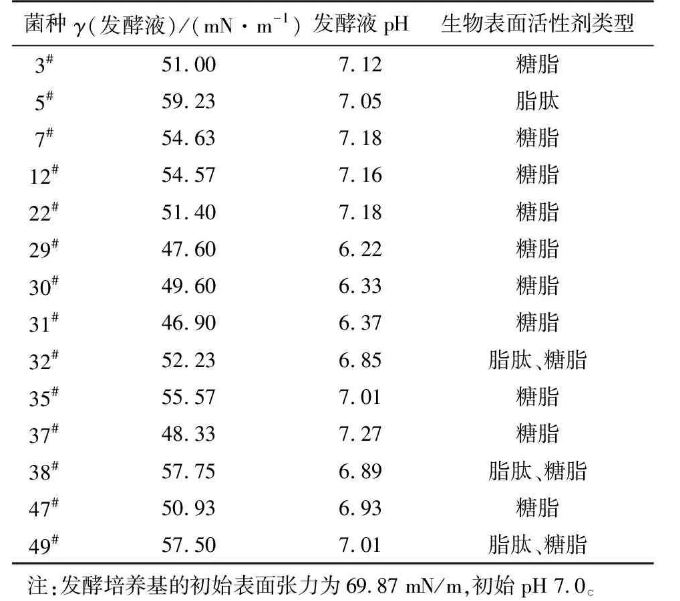 經富集分離共得到49株細菌,初步篩選出14株生長較好的目的菌株接種于發(fā)酵培養(yǎng)基。在微生物采油過程中,表面活性劑和有機酸可以把原油從巖層中剝離下來,提高原油流動性。因此,以發(fā)酵過程中發(fā)酵液的pH和表面張力的降低為指標,對初篩得到的菌株進行復篩,同時分析所產生物表面活性劑的類型,結果見表1。