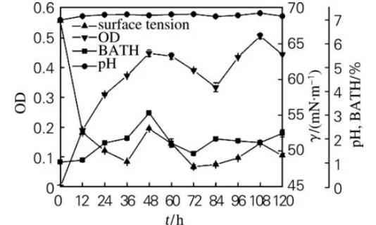 生物表面活性劑產生菌菌體密度、細胞疏水性與發(fā)酵液pH及表面張力的關系(二)