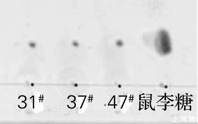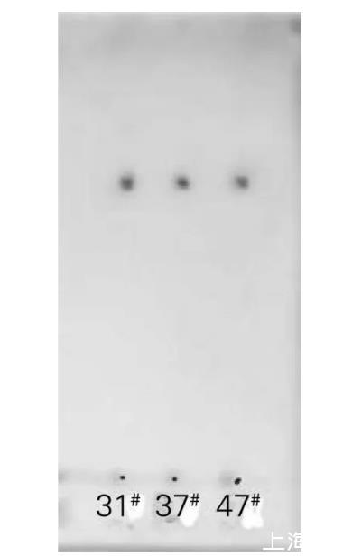 將菌株31#、37#和47#于30℃培養(yǎng)后,對發(fā)酵液萃取所得生物表面活性劑粗制品進行硅膠薄層層析,結果如圖4所示。將萃取所得生物表面活性劑粗制品進行酸解,硅膠薄層層析結果如圖5所示。