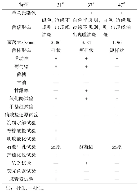 對篩選所得菌株進行常規(guī)生理生化特性實驗,結果如表2所示。根據表2所示結果和《伯杰氏(Berge)菌種鑒定手冊》的描述,可鑒定菌株31#為假單孢屬,菌株37#、47#均為芽孢桿菌屬。