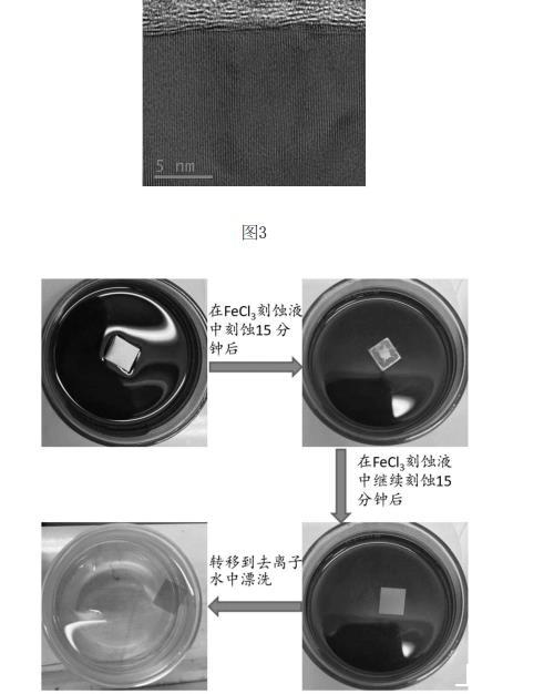 具體的,對于多層石墨烯/初始基底復(fù)合結(jié)構(gòu)以初始基底為銅舉例說明,實物如圖2(a)、圖2(b)所示,其截面如圖所3示;蝕刻液選用FeCl3溶液。為便于本領(lǐng)域技術(shù)人員理解,以小尺寸多層石墨烯/初始基底復(fù)合結(jié)構(gòu)的蝕刻過程進(jìn)行展示,蝕刻過程如圖4所示,從圖4可看出,得到的多層石墨烯薄膜可自懸浮于液面上。