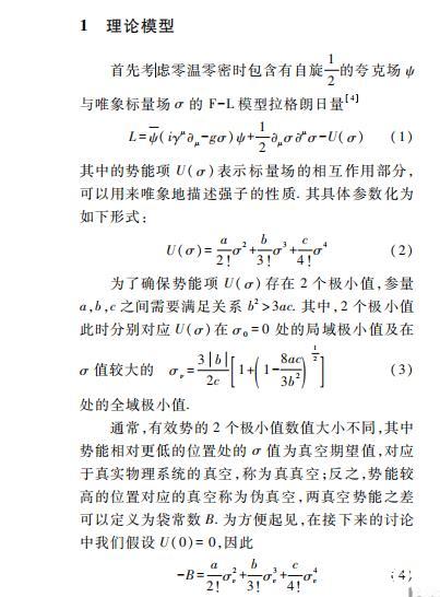 本文具體采用的模型是具有夸克禁閉性質(zhì)的Friedberg-Lee模型(F-L Model)。F-L模型最初用于描述低能時(shí)強(qiáng)子的行為,將強(qiáng)子看做真空中的袋狀孤子解,為QCD理論中的禁閉行為提供了非常直觀的物理解釋。不僅如此,該模型也被擴(kuò)展至有限溫度密度下夸克物質(zhì)的退禁閉相變的研究,提供了研究夸克強(qiáng)子相變性質(zhì)的有利手段。但是該模型只能給出有限溫度密度下夸克物質(zhì)一級(jí)相變的結(jié)果,無法討論平滑過渡(Crossover)相變和相臨界截點(diǎn)相關(guān)的物理問題,具有一定局限性。不過本文主要研究夸克強(qiáng)子一級(jí)相變下氣泡或液滴的動(dòng)力學(xué)問題,F(xiàn)-L模型是比較合適的模型。