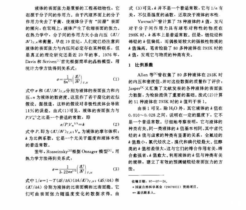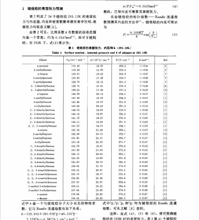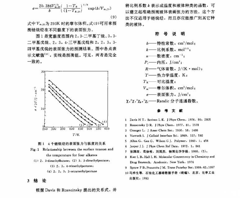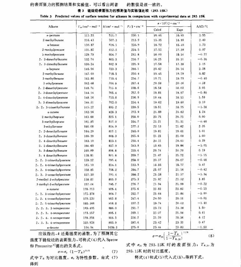 對Davis和Rosseinsky提出的關系檢驗表明,液體的表面張力σ與P1Vm1/3之比不僅取決于溫度,還與液體的種類有關,據(jù)此,建立了一個能由鏈烷烴的分子結構準確預測其表面張力的方法。