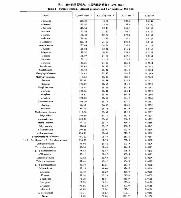 鏈烷烴的表面張力與內(nèi)壓、比例、溫度的關系