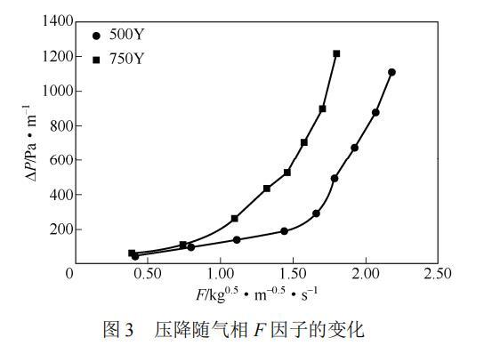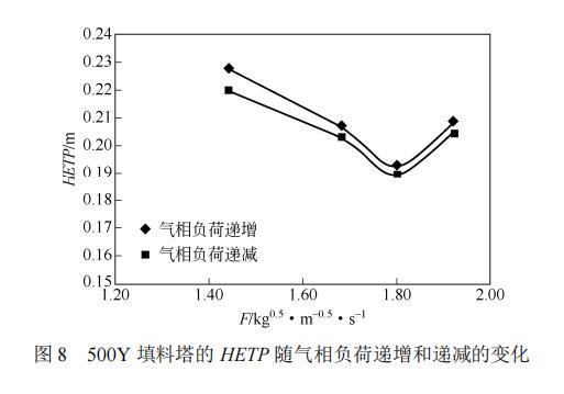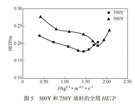 (1)在一定負荷范圍內(nèi),750Y填料的分離效率優(yōu)于500Y填料,但單位填料高度的壓降高于500Y填料,導(dǎo)致操作穩(wěn)定性比500Y填料差,處理量比500Y填料小。