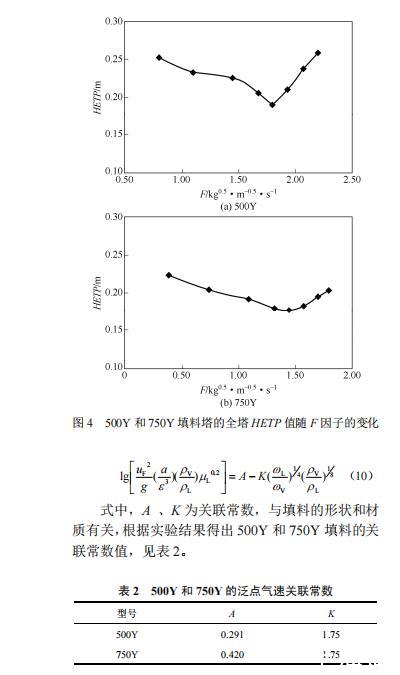 (2)實驗測定了氣相負荷從小到大直至液泛的流體力學(xué)性能和傳質(zhì)性能,得到了液泛時的實驗數(shù)據(jù),給定了操作的極限。500Y規(guī)整填料塔的最大F因子Fmax=1.8kg0.5/(m0.5·s);750Y規(guī)整填料塔的最大F因子Fmax=1.5kg0.5/(m0.5·s)。對于正庚烷-甲基環(huán)己烷物系,500Y填料的泛點氣速為uF=0.98m/s,750Y填料的泛點氣速為uF=0.82m/s。并由實驗結(jié)果擬合出貝恩(Bain)-霍根(Hougen)關(guān)聯(lián)式中常數(shù)A、K的值。對于500Y填料A=0.291,K=1.75;對于750Y填料A=0.420,K=1.75。