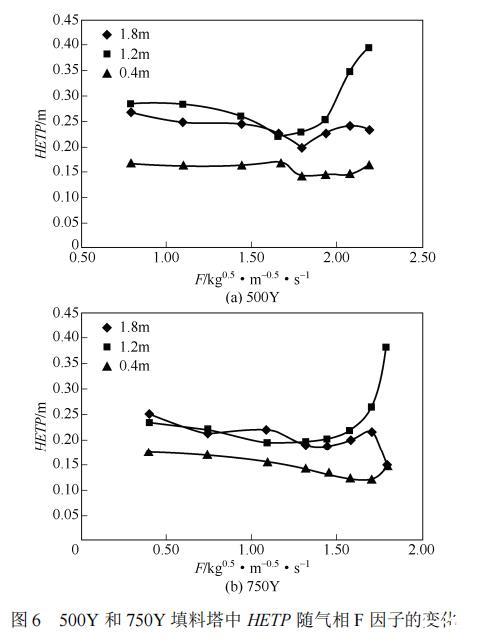 圖6為500Y和750Y填料塔中不同高度填料段HETP隨氣相F因子的變化。高度以填料層底部為基準。如圖6所示,填料段下部傳質(zhì)效率較高,上部傳質(zhì)效率下降。這是由于流體分布不均造成的。液相從頂端向下流動時,由于端效應(yīng),經(jīng)過一定高度填料層后液相才能鋪展開,接近均勻分布。而氣相因為受液相流動的影響,在填料塔下端氣相入口段分布比較均勻,在填料段頂端分布不均。從圖6還可以看出填料段中上部的傳質(zhì)效率波動較大,這是由于在此段填料內(nèi)流動狀況較為復(fù)雜,持液量和傳質(zhì)面積波動較大。Basden等指出持液量隨塔高并不是恒定的,在一定的氣液相流量下,Mellapak 500Y和MellapakPlus 752Y的持液量隨塔高的變化規(guī)律與本文中傳質(zhì)效率隨塔高的變化規(guī)律一致。