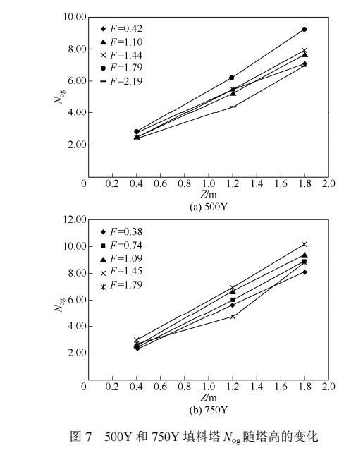 圖7為500Y和750Y填料塔中Nog隨塔高的變化。由圖7(a)可以看出,大多數(shù)情況下500Y填料塔中Nog隨塔高的變化為一條直線,即總體積傳質(zhì)系數(shù)沿塔高不發(fā)生變化。這是因為在適宜的操作范圍內(nèi),塔內(nèi)流動狀態(tài)比較穩(wěn)定,氣相負荷一定時,氣相傳質(zhì)系數(shù)不變。正庚烷-甲基環(huán)己烷為純有機物系,表面張力中性體系,塔內(nèi)形成的微弱的正表面張力梯度有利于液膜的穩(wěn)定,從而使有效傳質(zhì)面積保持恒定。由此可以推測,對有機負體系而言,負的表面張力梯度會引起液膜沿流動方向不斷破碎,造成有效傳質(zhì)面積的減小,因此Kya隨塔高下降不斷降低。這與耿皎等[18]在直徑為30mm的玻璃精餾塔中選用正體系庚烷-甲苯和負體系苯-庚烷的精餾實驗得到的結(jié)論一致。從圖7(a)可得當氣相負荷過小或過大時,500Y填料塔中Nog隨塔高的變化并不是一條直線,這說明總體積傳質(zhì)系數(shù)Kya沿塔高發(fā)生變化。當氣相負荷很小時,總體積傳質(zhì)系數(shù)Kya沿氣相流動方向減??;當氣相負荷很大時,總體積傳質(zhì)系數(shù)Kya沿液相流動方向減小。當流體流量過高或過低時,塔內(nèi)流動狀態(tài)極不穩(wěn)定,過低的氣相負荷,使氣相傳質(zhì)系數(shù)沿氣相流動方向減小、氣液相接觸減弱,即表現(xiàn)為總體積傳質(zhì)系數(shù)Kya隨塔高增加而減??;而過大的氣相負荷,引起液泛,液體積聚在塔上部很難流下,使沿液相流動方向液相傳質(zhì)系數(shù)減小、氣液相接觸減弱,即表現(xiàn)為總體積傳質(zhì)系數(shù)Kya隨塔高降低而減小。對比圖7(a)和7(b)可得,750Y填料塔中總體積傳質(zhì)系數(shù)Kya隨塔高的變化規(guī)律與500Y填料塔一致。