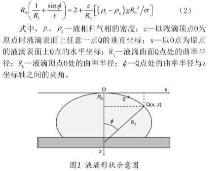 靜滴法是根據(jù)在水平墊片上自然形成的液滴形狀(如圖2所示)以及Young-Laplace方程來計(jì)算表面張力,式(2)即為靜滴法根據(jù)液滴外形計(jì)算表面張力的基本方程: