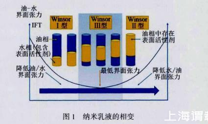 一般來說,納米乳液分為3種類型,即油包水型納米乳液(簡稱W/O)、水包油型納米乳液(簡稱O/W)和雙連續(xù)型納米乳液。Winsor根據(jù)油相或水相是否連續(xù)對納米乳液進行分類,如圖1所示,即WinsorⅠ型是油包水型納米乳液,表面活性劑存在于水相中;WinsorⅡ型是水包油型納米乳液,表面活性劑存在于油相中;WinsorⅢ型是通過表面活性劑吸附界面膜作用形成的雙連續(xù)相體系,油相水相相對平衡,同時WinsorⅢ型納米乳液在高濃度表面活性劑作用下不能完全溶解油水,因此產(chǎn)生了WinsorⅣ型單相納米乳液,該體系中油相和水相總量大致相同;其中WinsorⅣ型和WinsorⅢ型均是超低界面張力的納米乳液。