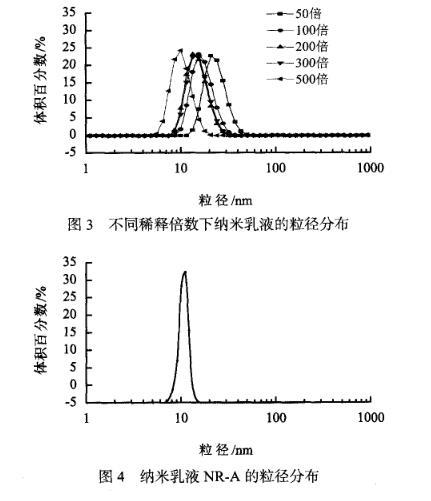 利用英國馬爾文2000激光粒度儀采用濕法進行微乳液粒徑測量。圖3為微乳液在不同稀釋倍數(shù)下得到納米乳液的粒徑分布。從圖3可知,微乳液稀釋50倍時得到的納米乳液粒徑D50為10~50 nm;微乳液稀釋500倍時納米乳液粒徑D50為5~20 nm;微乳液粒徑隨稀釋倍數(shù)的增加而減小,符合乳液的粒徑分布規(guī)律。納米乳液NR-A由微乳液稀釋500倍后制得,其粒徑分布結(jié)果見圖4,從圖4可知,納米乳液NR-A的粒徑分布較窄,90%膠團粒徑在11 nm以下。