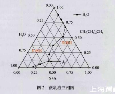 室內(nèi)研究中選用表面活性劑和助表面活性劑組合(S+A)為Tween 80、十八烷基二甲基溴化銨和正丁醇,油相為正辛烷,乳化溫度設(shè)為75℃時,制備WinsorⅣ型單相納米乳液;其中,S+A與油相正辛烷按9∶1、8∶2、7∶3、6∶4、5∶5、4∶6、3∶7、2∶8和1∶9依次混合,然后逐滴加入蒸餾水,觀察加入蒸餾水后乳液的澄清渾濁現(xiàn)象來確定H2O/(S+A)/正辛烷體系單相微乳液的微觀結(jié)構(gòu)類型,得到的相圖如圖2所示。選取三相圖中A點的微乳液用蒸餾水定容稀釋并以60 Hz頻率超聲波震蕩5 min后,制得納米乳液NR-A。