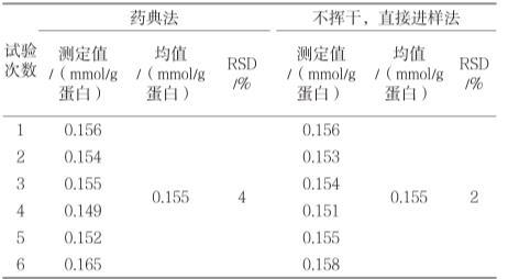由表2可知,方法優(yōu)化前、后的重復(fù)性試驗(yàn)RSD值分別為4%、2%。對(duì)兩組數(shù)據(jù)進(jìn)行方差齊性檢驗(yàn),F(xiàn)=1.108,P=0.317>0.05,方差具有齊性,即兩組數(shù)據(jù)精密度無顯著性差異,表明進(jìn)樣濃度降低并不影響實(shí)驗(yàn)結(jié)果的精密度。