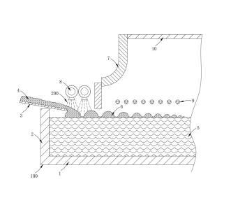 需要說明的是,通過將消泡劑200噴撒在料堆6表面,使消泡劑200均勻分布于料堆6的表面,在料堆6表面的玻璃配合料4在高溫作用下快速融化過程中,表面產生的微小氣泡立即被耐高溫的納米活性粒子破壞,實現(xiàn)自氣泡產生的源頭快速消除氣泡的目的,避免現(xiàn)有技術中,大量氣泡堆積并形成泡沫層之后才在泡沫表面噴撒消泡劑200進行除泡,影響窯爐100生產效率的問題。