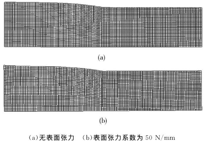 AE=1.2mm時(shí),表面張力系數(shù)為零和表面張力系數(shù)為50N/mm時(shí)的網(wǎng)格變形如圖4所示。從圖4可以看出,有表面張力和沒有表面張力的時(shí)候,網(wǎng)格的變形并沒有太大的區(qū)別,只是網(wǎng)格的變形量略微有些不同。說(shuō)明有表面張力的時(shí)候,自由表面的形變方式并沒有很大的變化。但在自由表面出口處的變形非常明顯。這說(shuō)明表面張力對(duì)微擠出自由表面出口處的流場(chǎng)影響很大。這是因?yàn)樽杂杀砻娉隹谔幍倪吔鐥l件突然變化,從而導(dǎo)致表面張力在此處的作用效果有較大變化。