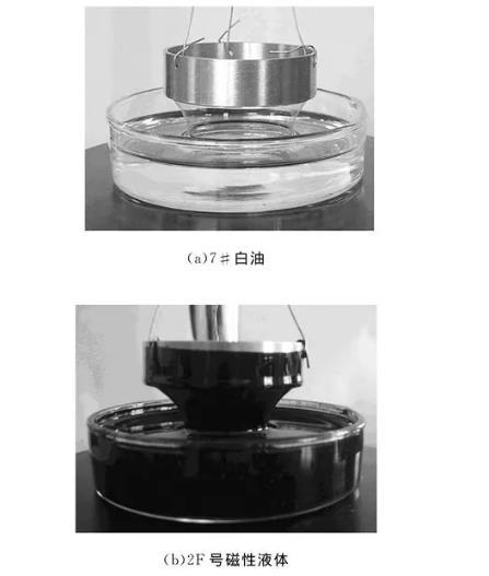 力敏傳感器定標(biāo)數(shù)據(jù)見表1,使用Origin軟件對(duì)直線進(jìn)行擬合,可得力敏傳感器靈敏度B=7.727V/N.測(cè)量無外加磁場(chǎng)作用的磁性液體表面張力系數(shù)時(shí),為直觀觀察拉脫時(shí)液膜的變化過程,將培養(yǎng)皿放置于電磁線圈端部進(jìn)行測(cè)量,圖3為拉脫過程中某一瞬間液膜的收縮狀態(tài),從圖中可看到,磁性液體的液膜拉得更長(zhǎng),液膜收縮的趨勢(shì)比白油更明顯,這主要是因?yàn)榇判砸后w中加入的表面活性劑降低了其表面張力??蓮谋砻鎻埩π纬稍韥矸治銎渲械脑颍旱谝?,液體表面張力系數(shù)的大小宏觀上反映出液體表面具有自動(dòng)收縮的趨勢(shì),表面張力系數(shù)較大的白油由于分子和分子之間的引力較大,表面層分子更容易向液體內(nèi)部運(yùn)動(dòng),某一拉力作用下,液膜斷裂,不易拉起較長(zhǎng)的液膜;第二,不同液體對(duì)同一種固體的浸潤(rùn)程度不一樣,表面張力系數(shù)小的液體(0.03N/m左右),幾乎能浸潤(rùn)一切固體;表面張力系數(shù)較大的液體,只能浸潤(rùn)某些固體;7#白油的表面張力系數(shù)大于磁性液體,片狀吊環(huán)和磁性液體的結(jié)合力大于片狀吊環(huán)和7#白油的結(jié)合力;液膜不容易和片狀吊環(huán)脫離,拉起來的液膜比較長(zhǎng)。