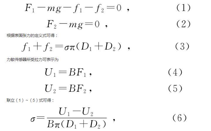 式中,F(xiàn)1和F2分別為液膜破裂前后瞬間片狀吊環(huán)所受的拉力,f1和f2為片狀吊環(huán)內(nèi)外表面液體的表面張力,θ為表面張力與豎直方向的夾角。m為片狀吊環(huán)的質(zhì)量,D1和D2為片狀吊環(huán)內(nèi)外徑,B為力敏傳感器靈敏度,U1和U2為液膜破裂前后瞬間力敏傳感器輸出的電壓值,σ為磁性液體的磁表面張力系數(shù)。