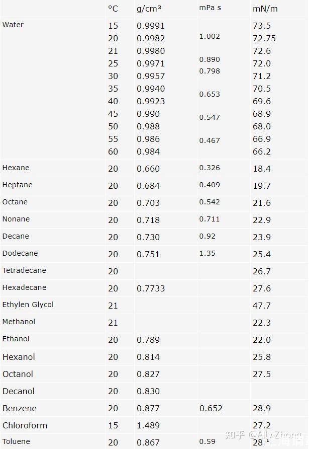 只有少數(shù)樣品可用于此類試驗測量。下表提供了一些此類液體的重要數(shù)據(jù)。這些數(shù)值由不同的作者和方法確定,可以作為標(biāo)準(zhǔn)。