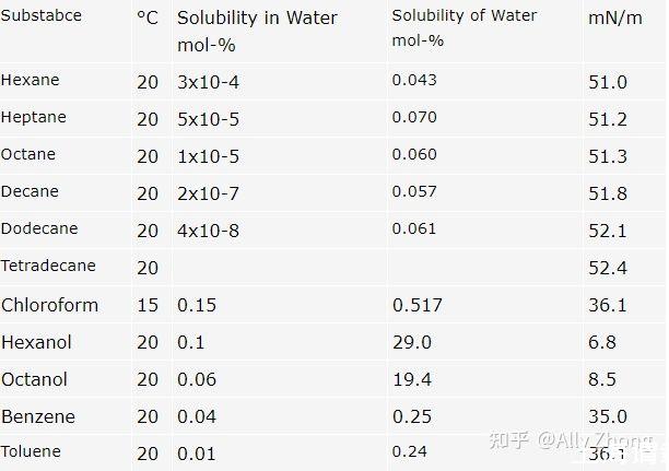 下表給出了兩種液體之間的界面張力值,兩種液體都是相互飽和的,以避免物質(zhì)通過界面轉(zhuǎn)移造成的影響。注意,所有液體在第二種液體中都有一定的溶解度。室溫下的溶解度極限也在表3中給出。