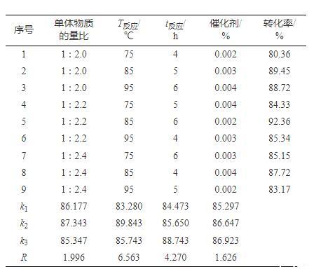 由表1可知,4種因素對轉(zhuǎn)化率影響程度依次為反應(yīng)溫度>反應(yīng)時間>單體物質(zhì)的量比>催化劑加量。在此基礎(chǔ)上,結(jié)合單因素分析實驗,確定最佳合成條件為n(DHSO):n(AGE)=1∶2.2,反應(yīng)溫度為85℃,反應(yīng)時間為6 h,催化劑加量為0.004%。在此條件下進行中間體DEPS的合成實驗,得到單體轉(zhuǎn)化率為93.65%。