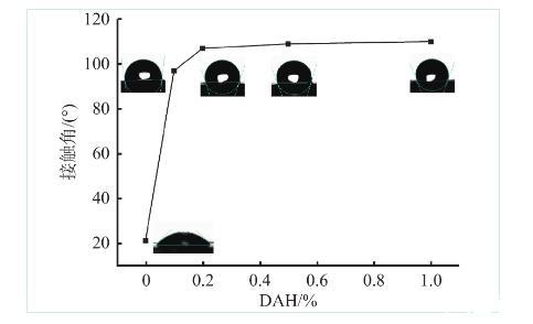 將巖心切片,使用800號(hào)金相砂紙將巖心片充分打磨,在室溫下將巖心片放入不同濃度的防水鎖劑DAH溶液,浸泡10 h,取出后在室溫下晾干,使用OCA-25型光學(xué)接觸角測(cè)定儀測(cè)定蒸餾水在巖心片表面的接觸角,結(jié)果見圖4。