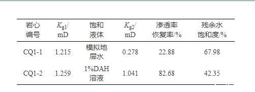 將一塊巖心截為兩塊,測(cè)量?jī)蓧K巖心干態(tài)下氣測(cè)滲透率Kg1,之后將兩塊巖心分別飽和模擬地層水和DAH溶液,使用氮?dú)庠谙嗤瑝毫ο聦蓧K巖心驅(qū)替至平衡,測(cè)量巖心氣測(cè)滲透率Kg2及殘余水飽和度,計(jì)算氣驅(qū)后滲透率與干態(tài)下滲透率比值,即為巖心滲透率恢復(fù)率。如表2所示,使用模擬地層水飽和巖心后,滲透率恢復(fù)率僅有22.88%,水鎖損害嚴(yán)重,而使用1%DAH溶液飽和巖心后,滲透率恢復(fù)率高達(dá)82.68%,水鎖損害程度大幅降低,殘余水飽和度更低,液相返排也更容易。