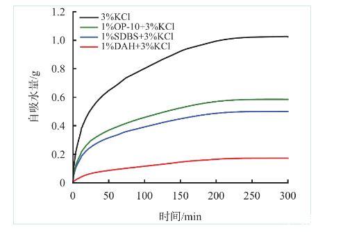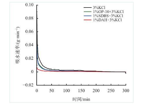 由圖5可以看出,水相會(huì)在毛細(xì)管力的作用下自吸入巖心,初始階段巖心的自吸水量較大,經(jīng)過200 min后達(dá)到平衡,自吸水量不再增加;加入DAH后,巖心自吸水量下降83.1%,且相較于常用防水鎖劑OP-10、SDBS效果更佳。圖6同樣表明,加入DAH后,巖心自吸水速率大幅降低,整個(gè)自吸過程中速率緩慢。上述實(shí)驗(yàn)表明,DAH可以減少因毛細(xì)管力被吸入地層的水相,從而降低水鎖損害發(fā)生的風(fēng)險(xiǎn)。