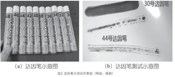 測(cè)試前先確定環(huán)境溫度、空氣濕度、以及被測(cè)物體表面溫度是否達(dá)到達(dá)因筆標(biāo)定的標(biāo)準(zhǔn)條件(溫差越大,測(cè)量誤差越大)。測(cè)試方法圖2(b)所示塑料袋張力測(cè)試,當(dāng)30mN/m筆測(cè)試時(shí),在2 s內(nèi)達(dá)因筆潤(rùn)濕了基材表面,沒(méi)有收縮或分散情況,說(shuō)明表面張力等于或大于30 mN/m;當(dāng)44 mN/m筆測(cè)試時(shí),在2 s內(nèi)達(dá)因筆沒(méi)有潤(rùn)濕了基材表面,出現(xiàn)收縮或分散水珠情況,說(shuō)明表面張力小于44 mN/m。還可用大于30 mN/m筆測(cè)量,以此類(lèi)推,直到測(cè)試結(jié)果在2 s內(nèi)改縮成水珠(球狀),則這測(cè)試之前一次的值被視為基材表面能,并作比較用。塑料袋PP材質(zhì)在溫度20℃時(shí)表面張力是31~33 mN/m。達(dá)因筆使用方便,保質(zhì)期為6個(gè)月。