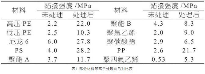 等離子法技術(shù)是利用等離子體高能轟擊、活化反應(yīng)等物理化學(xué)方法,將污染物從工件上剝離去除的一種工藝方法。起到表面有機(jī)物除去,有機(jī)物除去后表面活性化。用等離子法處理PP、PE、聚四氟乙烯等難黏接材料的黏接強(qiáng)度大大提高。經(jīng)處理后接觸角降低,表面張力改變,增加黏接劑對其浸潤和黏接力。如表1所示。等離子法處理需要投入處理設(shè)備,要根據(jù)實(shí)際需要選擇。