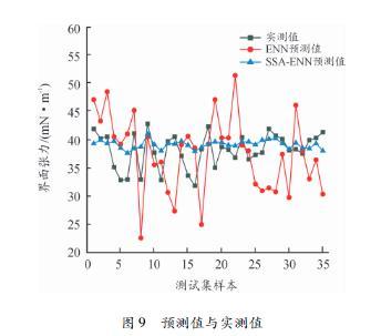 圖9給出了以140組樣本為訓(xùn)練集對ENN和SSAENN預(yù)測模型進行訓(xùn)練后,其余未參加訓(xùn)練的35組樣本的界面張力預(yù)測值。與測試集的界面張力實測值相比,ENN預(yù)測模型的預(yù)測值整體差值較大,預(yù)測差值最大為14.58mN/m,最小為1.38mN/m;SSAENN預(yù)測模型的整體預(yù)測差值較小,個別變壓器油測試樣本的預(yù)測差值較大,預(yù)測差值最大為6.08mN/m.