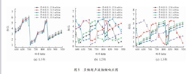 這是由于2個超聲波接收器所接收到的三相超聲波信號傳播所經(jīng)過的路徑和周期不同,導(dǎo)致對應(yīng)的相角不同。L2和L3的相頻響應(yīng)圖變化趨勢無相對明顯的變化規(guī)律,但超聲波信號在傳播過程中由于發(fā)生超聲弛豫、吸收、散射等現(xiàn)象導(dǎo)致相角的不同,其信息包含在相位頻譜中,對于分析變壓器油界面張力具有重要作用。