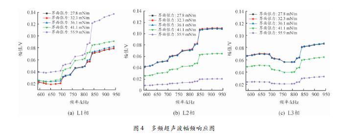 實驗共選取175組不同界面張力的變壓器油進行實驗。圖4為超聲波接收器接收到的三相信號的幅頻響應(yīng)圖,所選取的5組變壓器油樣的界面張力值分別為27.8、32.3、36.1、41.1、55.9mN/m.