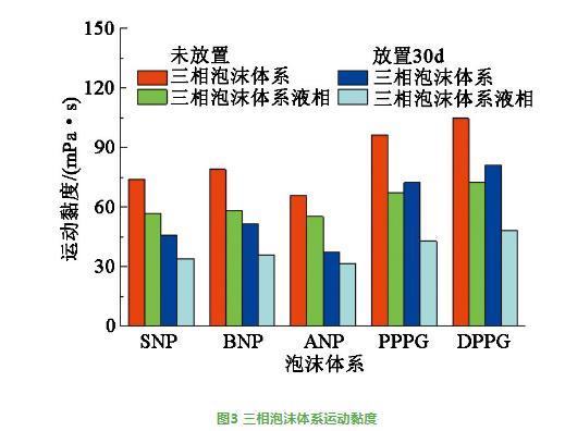 DPCG與DWS和聚合物具有較強(qiáng)的靜電、范德華力和纏繞作用,使其三相泡沫體系具有較大的拉伸黏度、剪切黏度和黏彈性,導(dǎo)致DPCG三相泡沫體系運(yùn)動(dòng)黏度最大。而PPCG僅具有短支鏈,與DWS和聚合物的靜電、范德華力和纏繞作用相對(duì)較弱,導(dǎo)致其運(yùn)動(dòng)黏度低于DPCG的。硬質(zhì)納米顆粒在溶液中與DWS和聚合物的靜電、范德華力和纏繞作用較弱,因此其三相泡沫體系運(yùn)動(dòng)黏度較低。
