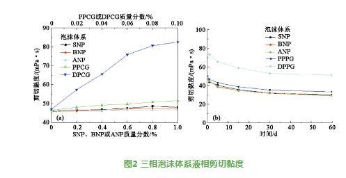 DPCG或PPCG溶于水后,吸水膨脹形成網(wǎng)格結(jié)構(gòu)的軟體內(nèi)核,外部具有親水支鏈,形成軟體微米顆粒。DPCG或PPCG與DWS和聚合物通過靜電、范德華力和纏繞作用,均勻分布在液相中。PPCG僅具有短親水支鏈,使其三相泡沫體系液相剪切黏度略增加;而DPCG具有長(zhǎng)親水支鏈,使其三相泡沫體系液相剪切黏度明顯增加。SNP、BNP或ANP為硬質(zhì)納米顆粒,對(duì)其三相泡沫體系液相剪切黏度不產(chǎn)生影響。隨時(shí)間增加,軟體微米顆粒溶脹更充分,對(duì)體系剪切黏度的貢獻(xiàn)更大;而硬質(zhì)納米顆粒體系的剪切黏度主要為聚合物黏度的宏觀體現(xiàn)。DPCG或PPCG體系的剪切黏度保留率高于SNP、BNP或ANP的。