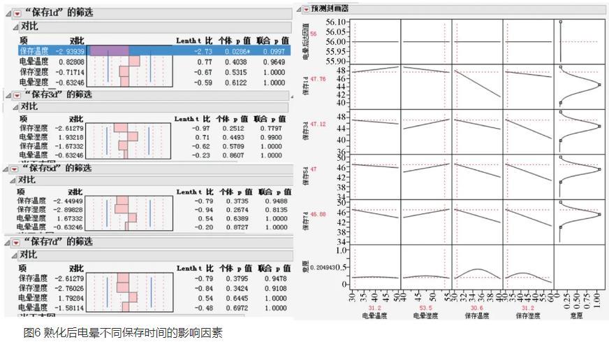 通過個體P值數(shù)據(jù)分析,保存溫度的影響最大,保存1 d影響因素從大到小依次為保存溫度、電暈溫度、保存濕度、電暈濕度;電暈溫度影響較小,可忽略。隨著保存時間的延長,保存濕度的影響逐漸增大。電暈溫度或濕度隨著保存時間的延長影響逐漸減小。因此整天分析影響因素為保存溫度>保存濕度>電暈濕度>電暈溫度。