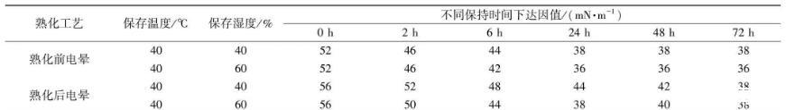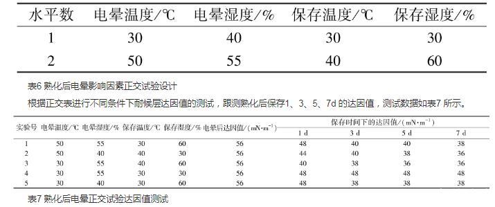 本文通過JMP軟件定制熟化前后電暈正交試驗設(shè)計,發(fā)現(xiàn)熟化溫度影響最顯著,熟化環(huán)境的濕度對耐候?qū)颖砻鎻埩τ绊懙诙@著,反應程度第三顯著,電暈溫度無明顯影響。在40℃條件下,對熟化濕度進行單因素分析,控制熟化濕度低于40%,基本上能使耐候?qū)颖砻鎻埩_到38 mN/m。熟化后電暈與熟化前電暈相比,在相同的保存時間內(nèi),熟化后電暈達因值較大。