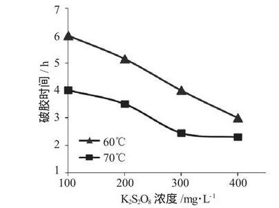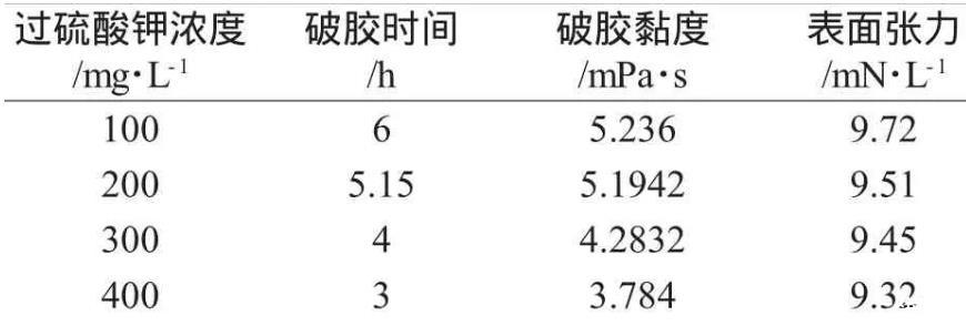 (1)在實(shí)驗(yàn)溫度60℃下,通過對比過硫酸鹽濃度不同,濃度越高,破膠時(shí)間縮短,破膠液粘度和表面張力逐漸降低。