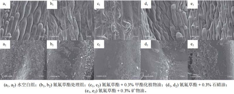 通過掃描電鏡觀察稗草葉片結(jié)構(gòu)變化探究了油類助劑對氰氟草酯防除稗草的增效作用。作者分別對比了純水、氰氟草酯處理和添加油類助劑的氰氟草酯處理后的稗草葉片結(jié)構(gòu),發(fā)現(xiàn)水對稗草葉表面的蠟質(zhì)層和表皮細胞沒有任何影響(圖1a1,a2),氰氟草酯使表皮細胞略有萎縮(圖1b1),溶解了少量的表皮蠟質(zhì)層(圖1b2),而添加油類助劑后均發(fā)生表皮細胞變窄萎縮和蠟質(zhì)層溶解的現(xiàn)象(圖1c1-e2)。其中,石蠟油和礦物油能使表皮細胞變窄變小,水分減少(圖1d1,e1),溶解大約30%的表皮蠟質(zhì)(圖1d2,e2)。甲酯化植物油(MSO)能較大程度地使表皮細胞萎縮(圖1c1),溶解超過50%的蠟質(zhì)層(圖1c2)。正是因為MSO(體積分數(shù)0.5%)溶解了大量稗草葉片的表皮蠟質(zhì)層,嚴重破壞了葉片的角質(zhì)層,從而極大地增強了稗草葉片對氰氟草酯的滲透和吸收能力,使其對氰氟草酯防除稗草的防效提高了78.7%。